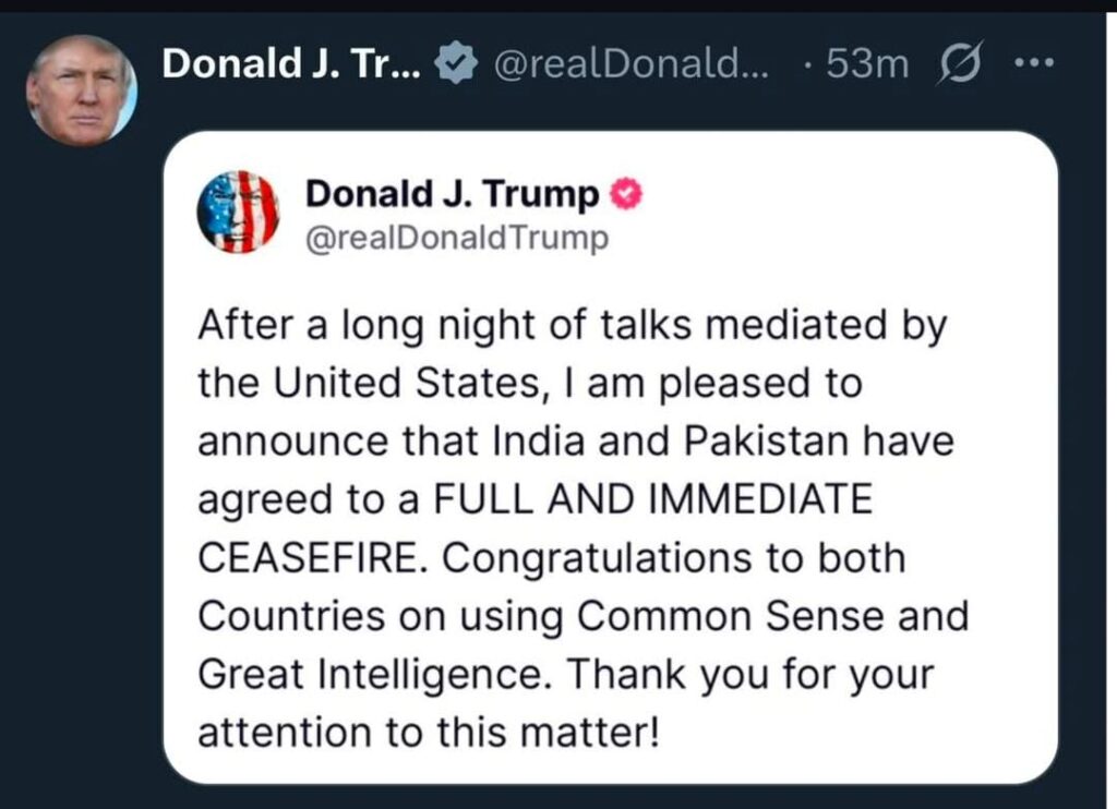 पहलगाम अटैक के बाद से ही पाकिस्तान और इंडिया के बीच लगातार रिश्ते गर्म होते दिखायी दे रहे थे। जिसके बाद दोनों देशों के बीच जंग का माहौल बना हुआ था। इतना ही नहीं बल्कि देर रात को देशभर में क्यों जगह ड्रोन हमले व एयर हमले भी किए जा रहे थे। इससे दोनों ही देशों के बीच दहश्त का माहौल बना हुआ था। लेकिन अब भारत और पाकिस्तान ने राहत की साँस ले ली है। दरअसल, अभी कुछ देर पहले ही अमरीका के राष्ट्रपति डॉनल्ड ट्रम्प ने एक ट्वीट करके दोनों देशों को सीज़ फायर की बढ़ायी देते हुए एक पोस्ट की थी। जिसके बाद से ही हर कोई उस पोस्ट की स्च्चै जानने में लगा हुआ था। इस पोस्ट में राष्ट्रपति ट्रम्प ने लिखा था की , “लंबी रात तक बातचीत के बाद अब दोनों देशों ने स्मझदारी दिखाते हुए आख़िरकार सीज़ फायर का फ़ैसला ले लिया है। जिसके लिए मैं काफ़ी खुश हूँ और दोनों देशों को बधाई देना चाहता हूँ।”